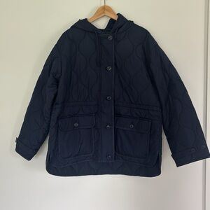 Tags: QuiltedOuterwear, UtilityStyle, MinimalistLook, CozyLayer, OversizedFit, HoodedJacket, FallFashion, StreetStyle, ClassicCool