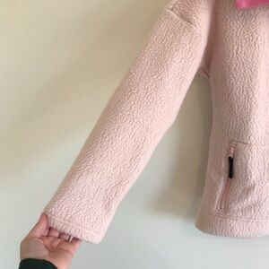 Features: Light pink teddy fleece jacket, half zip closure, long sleeves, front pockets.