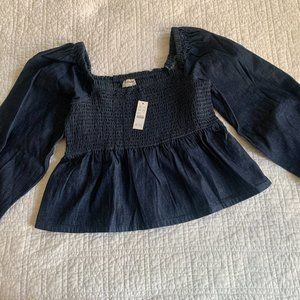 NWT J. Crew Puff-Sleeve Dark Blue Rinse Chambray Denim Smocked Top, size Large