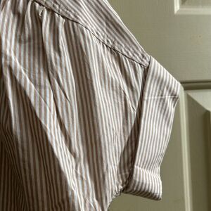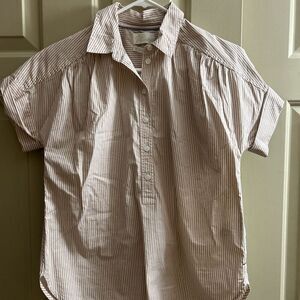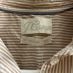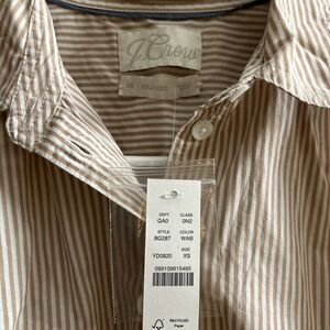 NWT J. Crew Relaxed-Fit Short-Sleeve Cotton Poplin Popover in Stripe. Brown and white stripe. Sz XSThis relaxed short-sleeve version is the perfect thing to pop over (see: the name) any outfit. By buying cotton products from J.Crew, you're supporting our investment in Better Cotton's mission to help cotton communities survive and thrive while protecting and restoring the environment. This product is sourced through a system of mass balance and therefore may not contain Better Cotton.