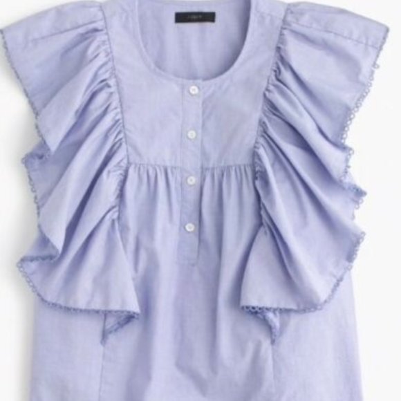 *NWT* J. Crew Ruffle-Front Top in periwinkle.The classic-with-a-twist shirt, thanks to dramatic ruffles. Made of cotton in size 8.
