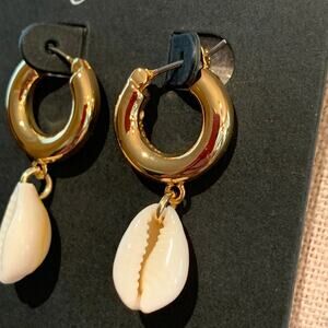 NEW WITH TAGS - These J. Crew Shell Drop Gold Huggie Hoop Earrings are precious! Perfect for a winter vacation, these chunky gold huggie hoops have pretty cowrie shell details. Pull your hair back to really show them off. Titanium, brass casting, coach shell, cubic zirconia, gold plating. Import. Length: 1 1/2".
