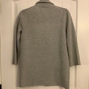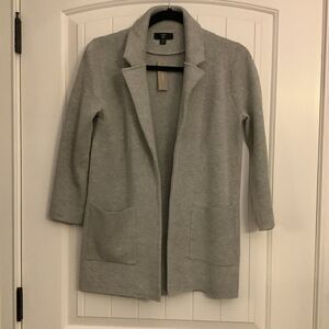 Very nice quality gray sweater jacket with open front and two front pockets. Polyester/merino wool blend. Size XXS.