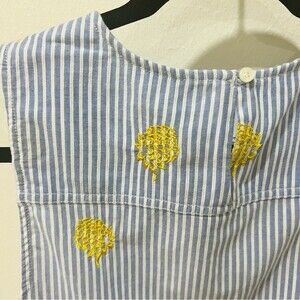 Blue & white striped sleeveless top with yellow embroidered pineapples and side tie. Keyhole in back with button closure.