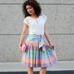 Stretchy / Mid to Light Weight / Lined / Gingham RainBow Print / Bow Tie Detail at Waist / Pleat Detailing / Inset Hgh