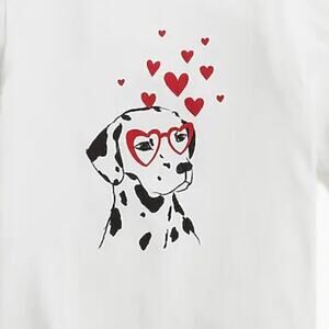 NEW WITH TAGS - RETAIL $40 - This J. Crew White W/Heart Dalmatian Graphic Tee is precious! Cotton. By buying cotton products from J.Crew Factory, you're supporting more responsibly grown cotton through the Better Cotton Initiative. Slightly loose fit. Short Sleeve, Hits at hip. Machine wash. COLOR -white with black and red graphic.