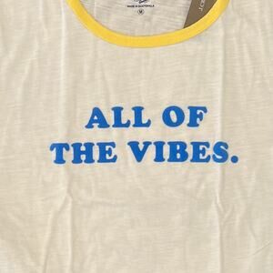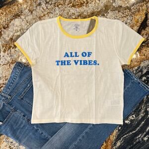 NEW WITH TAGS - RETAIL $45 - This J. Crew White w/"All of the Vibes" graphic T-Shirt is precious! Our '90s-inspired shrunken crewneck speaks for itself, but we thought we'd add a little something extra to this version (aka colorful trim and lots of good energy). Cotton.Machine wash. COLOR white/ivory