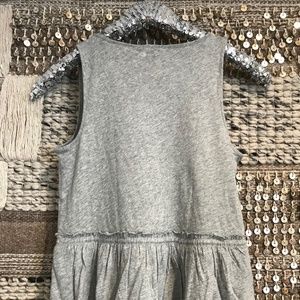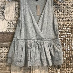 Super cute light heather gray surplice tank top with double-layer ruffle at bottom hem and working tie under bust. This is a size XXXS but I am a size 4-6 with 34E bust and it fit me :)