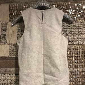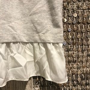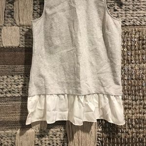Brand new J Crew crewneck tank in a light space gray fabric, with a softer, lighter and shinier cream fabric ruffle along the entire bottom hem. Cotton blend, size Small.