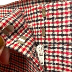 These cute pants are brand new with the tags attached. They are red, white, and blue plaid. They do have a little stretch. They have a tab closure. They have a slight wider leg at the bottom.