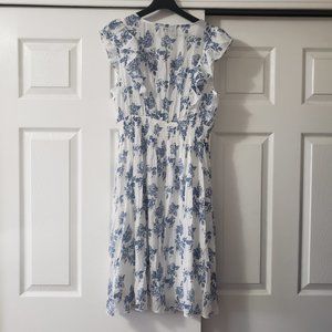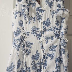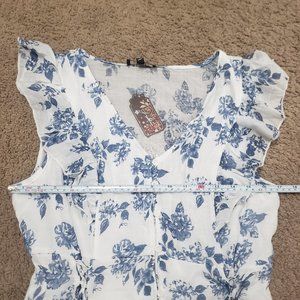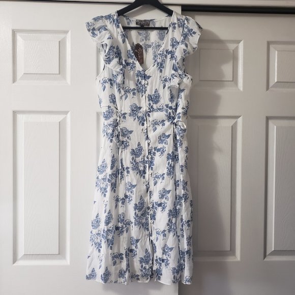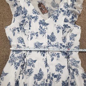 NWT J GLEE Boho Dress Blue/White Floral Knee Length. Women's Size L. Tie waist on the sides w/lining.