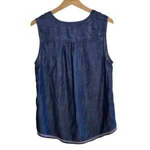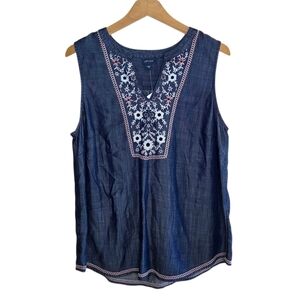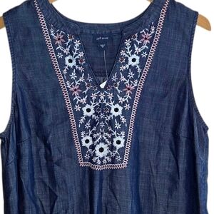 NWT J. Jill Denim | Red Ivory Floral Embroidered Denim Blue Tank Top Size Medium