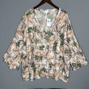 NWT J Jill LOVE LINEN Top Size 4X Flounce Sleeve V-Neck Tropical Palm Leaves NEW