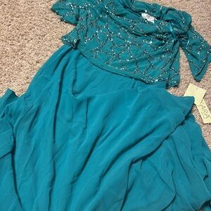 J Kara Women's C-Neck with 3/4 Sleeve Beaded Long Dress Aqua Color NWT