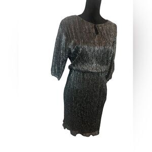 Radiate elegance and charm in this J. Taylor knee-length cocktail dress, perfect for any party or special occasion. The shimmering metallic/gray hue, crafted from luxurious metallic fabric, ensures you stand out in any crowd. The dress features a sophisticated keyhole neckline and flattering half sleeves, while the elastic waistband offers a comfortable fit that accentuates your silhouette. Whether you're attending a wedding, gala, or evening soiree, this dress is your go-to choice for a stunning appearance. New with tags (NWT).