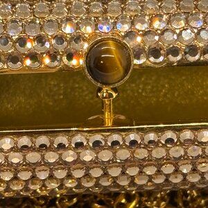This incredibly sparkly gold evening purse is embellished with gold colored crystals.
