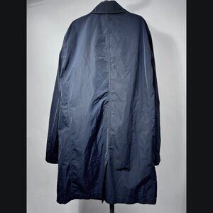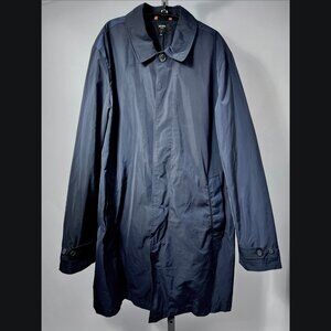This is a Brand New with Tag JACK SPADE Packable trench coat, a water-resistant, thigh-length trench-style outerwear garment designed for the modern man, offering functionality and fashion on your rainy days. Key features include its navy blue color, packable design for easy storage, and a waterproof exterior for staying dry. It has a lightweight feel, making it ideal for layering and suitable for mild climates. This Jacket has two exterior side pockets and two interior pockets by the chest sides. There is also an interior pouch pocket with zipper to conceal the packed coat when you need to and it comes with two extra buttons attached to the interior lining. It has underarm grommets for ventilation a concealed button front closure and a vent in the back. This jacket has amazing tailoring construction and is partially lined, in the arms, back and front part of the chest.