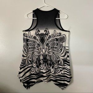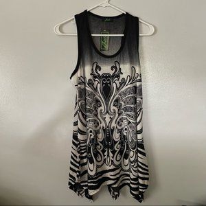 NWT- Comfortable and sporty racer back top. 95% polyester, 5% spandex. Size S/M. Uneven hem-line.
