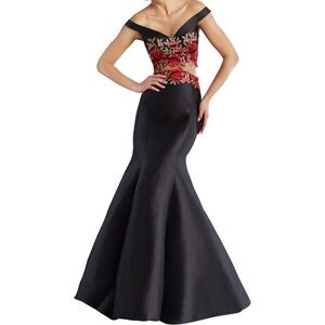 NWT! JANIQUE Elegant Two Piece Black Hand Embroidered Floral Off-Shoulder Gown
