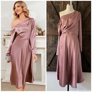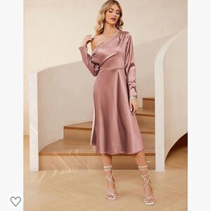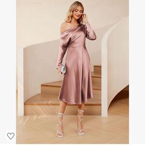 Charming Show: This chic satin dress has slanted shoulders and long sleeves which can make your neck and shoulders slimmer, show your swan neck, highlight your elegance and femininity. The women's silk A-line dress can not only cover your belly, but also modify your body curve, keeping you comfortable all day. If you want a loose fit, please choose a larger size.