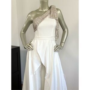 The Gavin Jumpsuit is a classic one-piece with an asymmetric bow neckline and tapered leg. It features a sequined shoulder detail and a removable over skirt in a stretch crepe and satin fabric.
