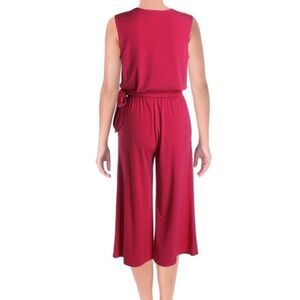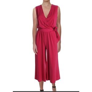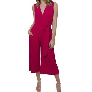 Beautiful deep bright pink cropped jumpsuit. A flowy knit with some good weight to it. Sleeveless and cross front with a snap to prevent wardrobe malfunctions. Removable tie belt to size to the perfect fit!