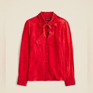 NWT J CREW Removable tie-neck button-up shirt in bow-print crepe de chine in red