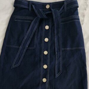 Knee-length pencil skirt made from a linen and polyester blend with a button-up front, a removable belt, and front patch pockets. The skirt has a contrast stitch detail.