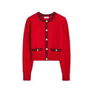 Details: * Our comfiest lady jacket silhouette, now in cashmere. This take on the sophisticated style comes with contrast trim details that add a pop of color and polished gold buttons. Cropped fit, hits above waist. Hits slightly above hip. 100% cashmere. Hand wash. Import. *