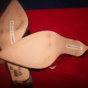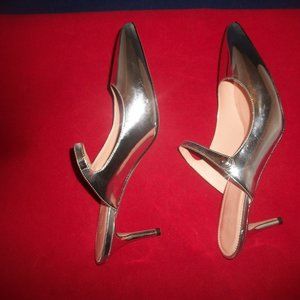 A pair of new unworn J. Crew pointy silver leather Colette mule-pumps with strap across the front and side button -- a very French style -- made in Italy. In new unworn condition with pen writing and price stickers on soles. ($248). Marked 8. Insole 10" Width 3 & 3/8" Heel 2.75"