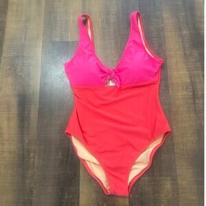 Stay stylish poolside or at the beach in this NWT J.Crew one-piece swimsuit, featuring a flattering two-tone colorblock design in vibrant pink and red. The playful bow accent and front cutout add just the right amount of charm, while the full coverage and soft stretch material provide all-day comfort.