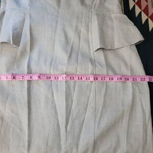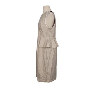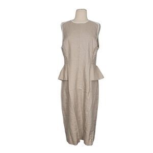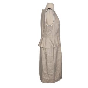 J. Crew Peplum Stretch Linen Blend Sheath Dress in Flax Oatmeal color with white trim, round neck, sleeveless, knee length, back zip closure.