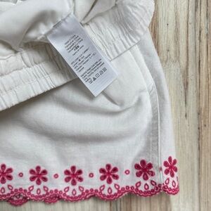 Adorable linen drawstring short with pink embroidered trim. Generously sized IMO. Perfect for summer or the beach!