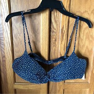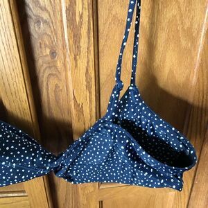 This NWT J. Crew strappy twist bikini top in navy blue and white retro polka dot pattern is perfect for a day at the beach. The top is made of a lightweight polyamide blend material and features spaghetti straps that can be adjusted for comfort. The twist accents add a touch of designer style to this beach essential.