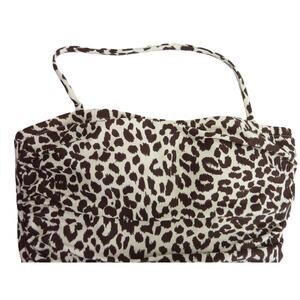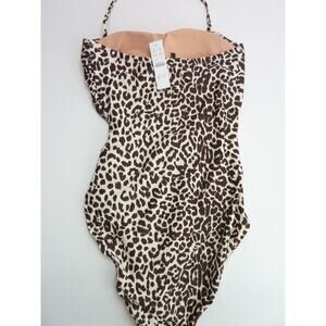Brand new. Ruched one piece in a brown and white leopard animal print. Detachable string strap for versatility and can be worn as single shoulder swimsuit or strapless. Removeable padding at bust.