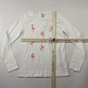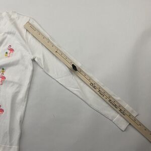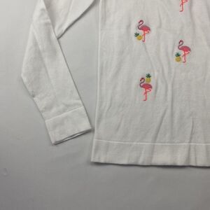 This beautiful white sweater from J.Crew features a fun pattern of solid flamingos and pineapples, making it perfect for any tropical-themed occasion. The tight-knit cotton fabric ensures warmth and comfort, while the long sleeves and crew neck provide a classic look suitable for both casual and workwear settings. Machine washable for easy care, this pullover sweater is available in size XS and priced at $79. Ideal for travel, parties, cocktails, or simply lounging at home, this sweater is a must-have for any fashion-conscious woman.