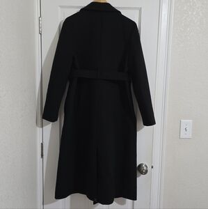 Elegant black long coat with a matching belt. Perfect for a stylish look.