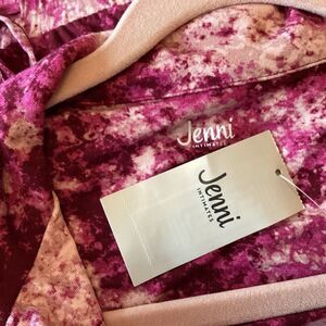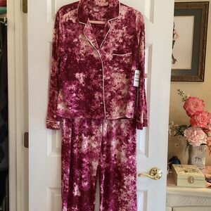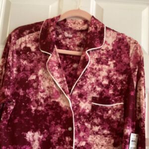 NWT. Jenni Intimates/Macy’s Brand Women’s 2 pc pajama set in beautiful mottled shades of pinks and wines. This set feature long, straight leg pants with fully elasticized waste with working drawstring. Hem features white piping. Long Sleeve top buttons down the front and features a collar with white piping as well. Working front pocket. Piping accents with cuffs and pocket as well. Extra soft jersey knit. Showing photos of front and back sides along with fiber content and care tags. Rayon and spandex blend is machine washable.