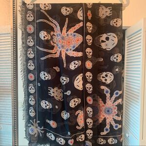 An embellished skull and spider pattern details this soft, layerable scarf for seasonal flair.