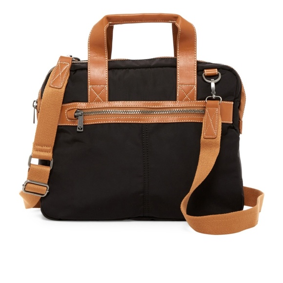 Zip around top closure. Exterior features 1 wall zip pocket and 2 wall slip pockets with snap button closure. Interior features center divided zip pocket, 1 wall zip pocket and 2 pen slots. Measures approx. 15" x 12" x 3". Handle drop measures approx. 4". Adjustable strap drop measures approx. 20" - 32". Nylon exterior with leather trim, textile lining.