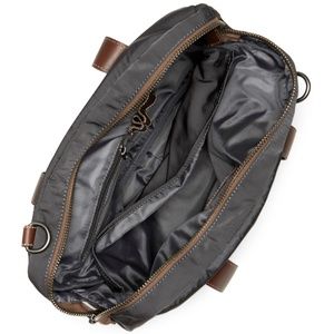 New with tags J.FOLD Montreal Top Handle Nylon & Leather Tote Bag in black and tan. Detachable, adjustable handle strap with dual top handles.