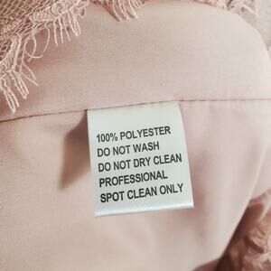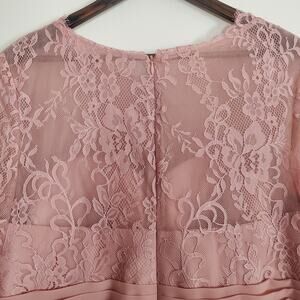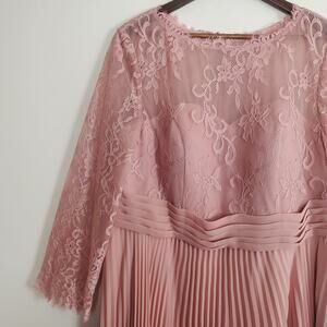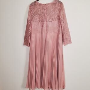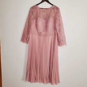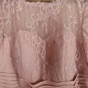 Dusty rose or blush light pink formal dress for mother of the bride, mother of the groom, bridesmaid, or wedding guest. Sweetheart bodice underneath sheer scalloped lace overlay with crew neckline and 3/4 length sleeves. Cummerbund of gathered pleats accentuates the waistline. Flowy pleated midi or ankle length skirt (depending on your height). It is tagged a custom size 44" bust, 43" waist. Based on my measurements below it is closer to a 42" bust, 40" waist. Falls somewhere between a plus size 16 and 20 per JJ's size chart.