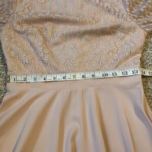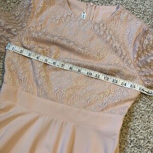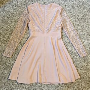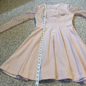 This NWT JJs House Women's Dress in size S is a romantic ballerina style dress made from pink polyester lace fabric. It features a round neck, long sleeves with glitter accents, and a zip closure. The dress is knee-length and has a feminine A-line silhouette, perfect for parties, formal events, or weddings during the summer, fall, or spring seasons.