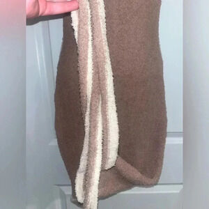 Has tie at the bottom for multiple looks. Can wrap around legs low, higher or tied. Beige and cream contrast as seen. Has stretch that can make this fit medium to XL
