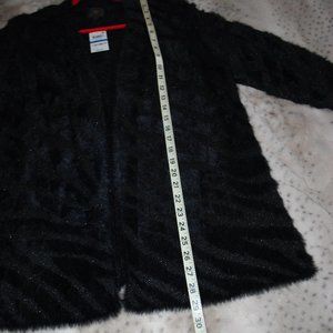 This black open-front sweater features an allover subtle zebra animal print as well as a little silver metallic thread in it. Open front drape style and has a little stretch to it. Machine washable. NEW WITH TAGS. By JM Collection, size PXL.