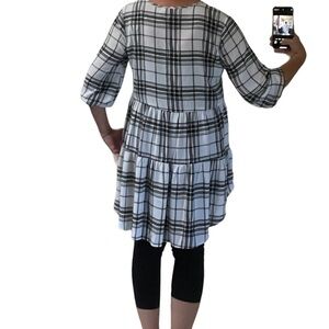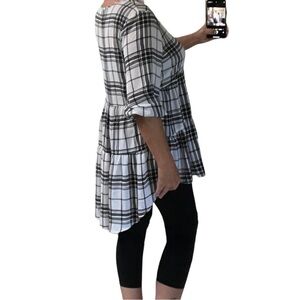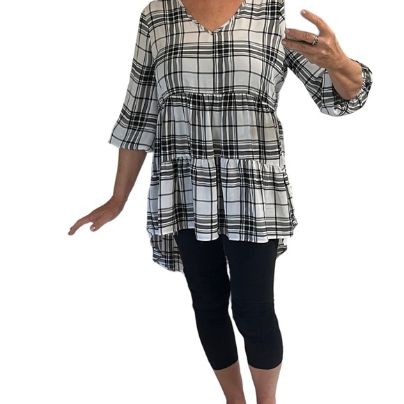 Cascading ruffle flowing around the back hem line, black and white super lightweight flows with your every movement. Style and chic design. Summer wear any day. Sheer light