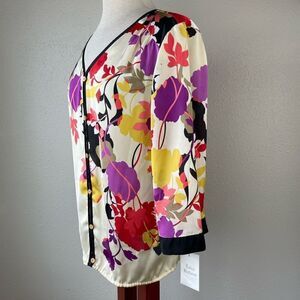 Beautiful and fun colors and floral design on this soft top by JM Collections. It measures 21 inches armpit to armpit laying flat and 27 inches in length from shoulder to hem.