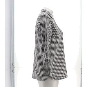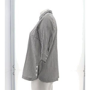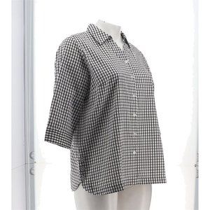 Features: button-front closure, V-neckline, 3/4-length sleeves, Plaid, functional buttons at curved side seam slit, textured check fabric