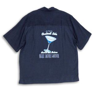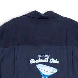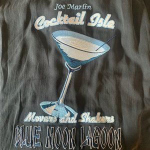 100% SILK BUTTON DOWN SHIRT, NAVY BLUE WITH BACK EMBROIDERING WHICH HAS A PICTURE OF A COCKTAIL AND READS " JOE MARLIN COCKTAIL ISLE, BLUE MOON LAGOON, MOVERS AND SHAKERS".