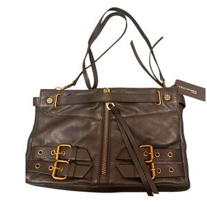 Detachable crossbody strap. Great buckle and zipper details. One zipper pocket inside and 3 slip pockets inside
